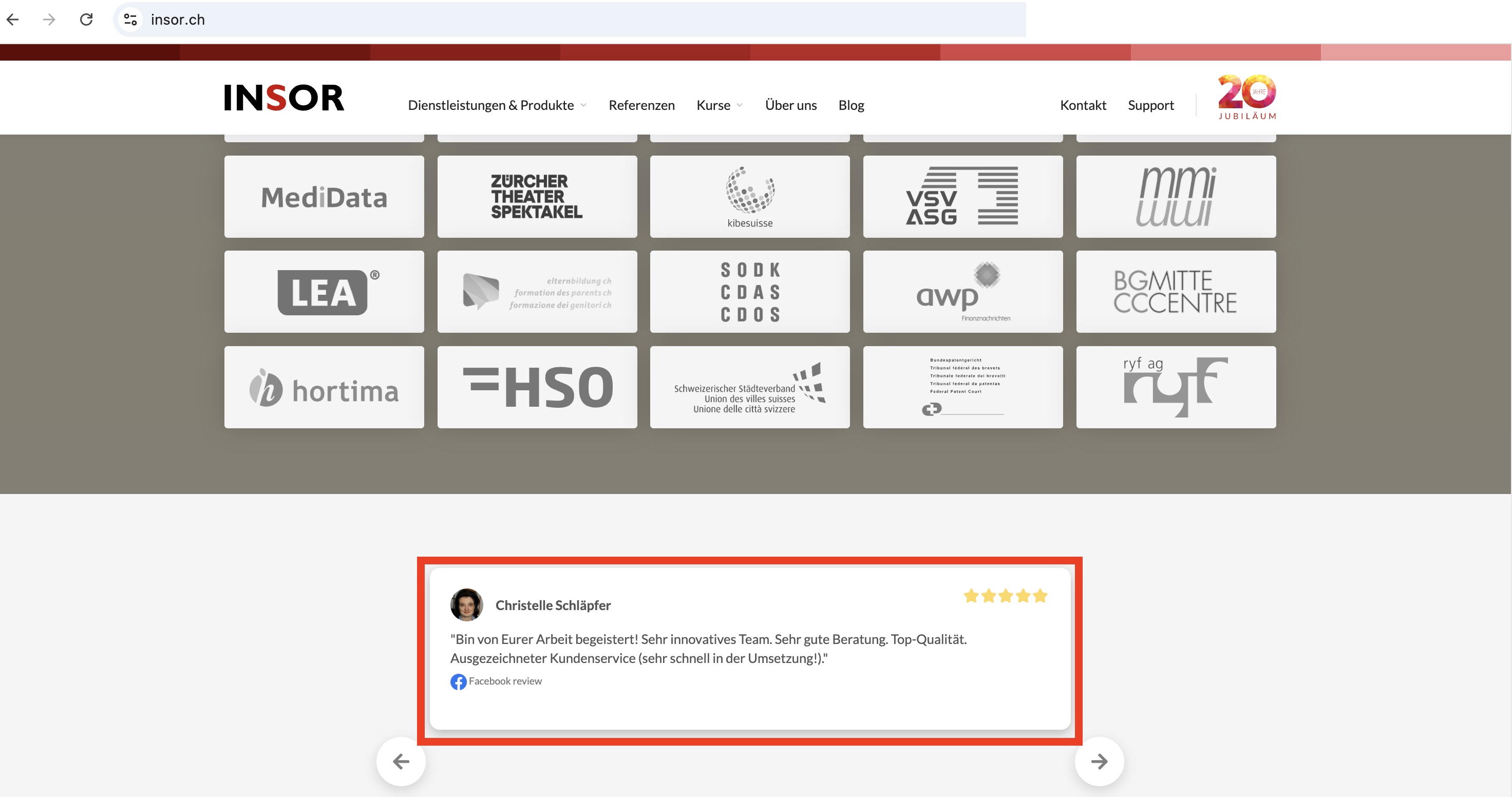 Wenn du Kund:in von INSOR bist, kannst du Endorsal bereits ab 19 CHF pro Monat nutzen. Die technische Umsetzung und Integration bieten wir dir optional als zusätzlichen Service an – ganz nach deinem Bedarf. Wenn du mehr über Endorsal erfahren möchtest oder herausfinden willst, wie die Integration auf deiner Website aussehen kann, melde dich gerne bei uns. Wir helfen dir beim Einrichten, Einbinden und Optimieren, ganz ohne Stress und Schritt für Schritt. Schreib uns über das Kontaktformular oder ruf uns direkt an. Wir zeigen dir alles und setzen es gemeinsam mit dir um.