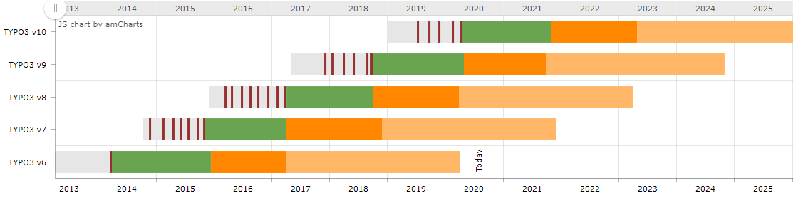 Bei einem System wie zum Beispiel TYPO3 weiss man erfahrungsgemäss, dass es pro Jahr etwa 4-6 wichtige Updates zu erledigen gibt. Weiter kommt alle drei Jahre eine neue Version heraus, auf welche man upgraden sollte - man könnte aber auch eine überspringen und erst nach 6 Jahren upgraden. Wie die Versionsherausgaben im Falle von TYPO3 funktionieren, sieht man unten.